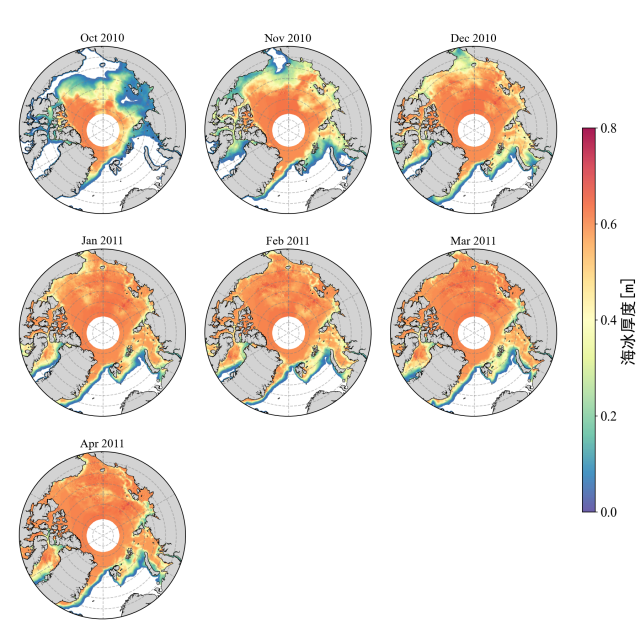 2010/2011年海冰冻结期(2010年10月-2011年4月)逐月平均海冰厚度(其中4月份为前15天的平均海冰厚度)