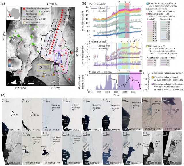 该研究基于遥感数据分析了2014年10月至2025年8月Pine Island冰架冰流速的变化,发现在2017—2020年的加速期之后,Pine Island中部冰架( the central Pine Island Ice Shelf)于2022年发生了明显的减速,随后Piglet冰川前缘也发生了两次减速。这些减速事件发生于2020年2月10日中部冰架崩解之后,并伴随派恩岛湾固定冰的持续覆盖和海温的持续上升。
